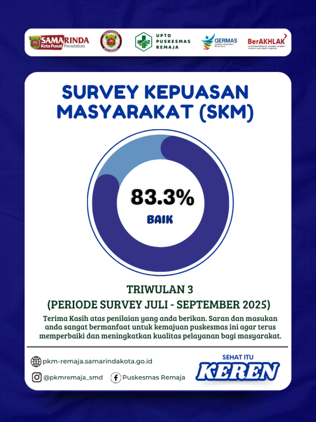 UPTD Puskesmas Remaja mengucapkan terima kasih kepada seluruh masyarakat yang telah berpartisipasi dalam Survey Kepuasan Masyarakat (SKM) periode Juli – September 2025.
